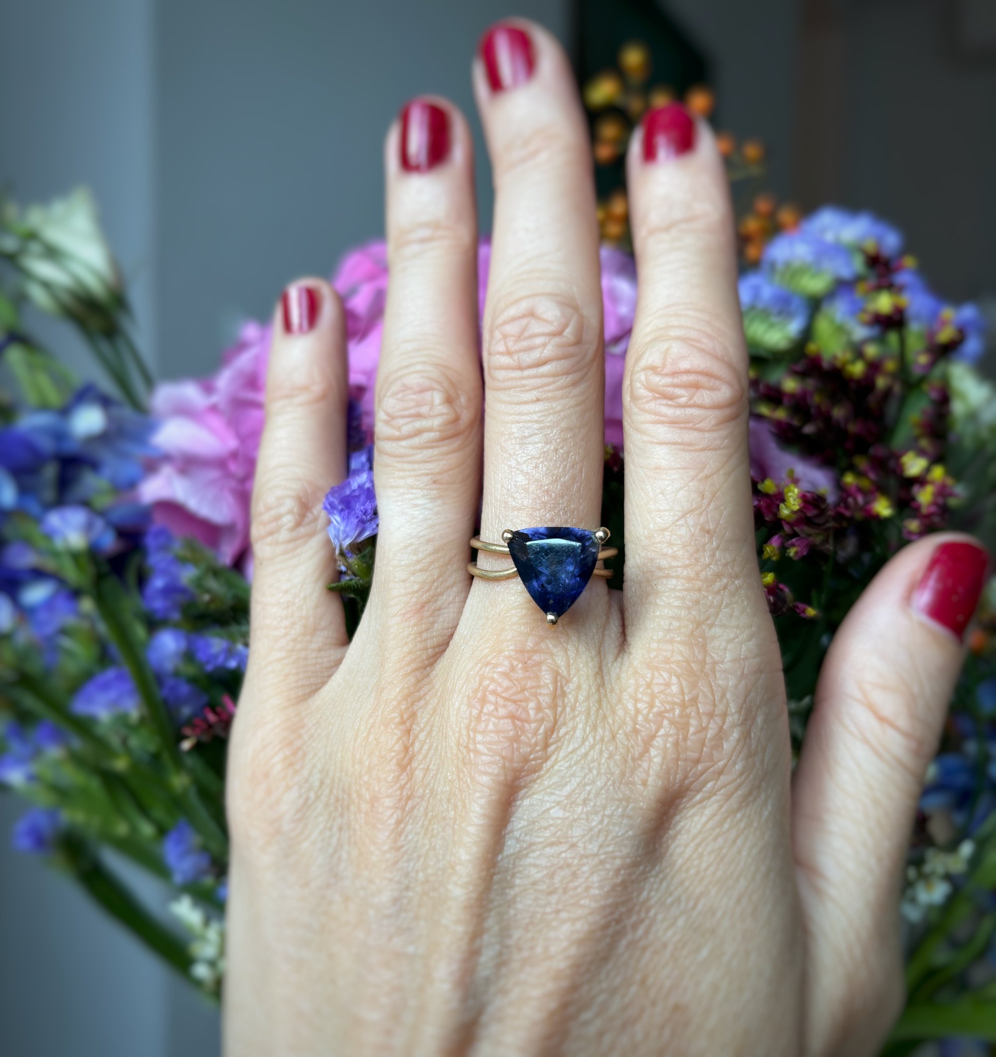Un design essenziale che mette al centro la bellezza della pietra: una iolite taglio trillon, con la sua caratteristica forma triangolare e i riflessi blu intensi che variano con la luce.