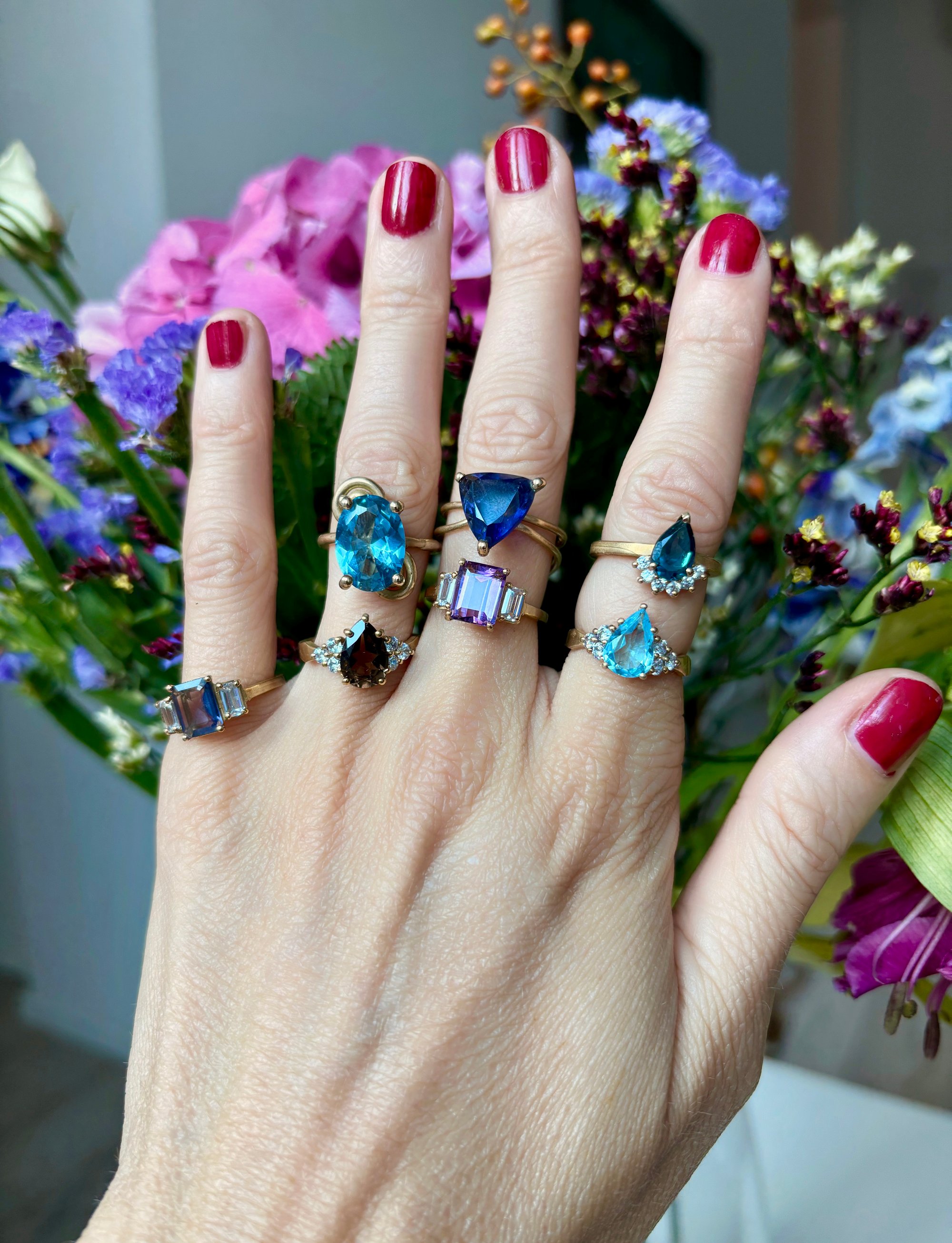 A simple design that highlights the beauty of the stone: a trillion-cut iolite, with its distinctive triangular shape and intense blue reflections that change with the light.