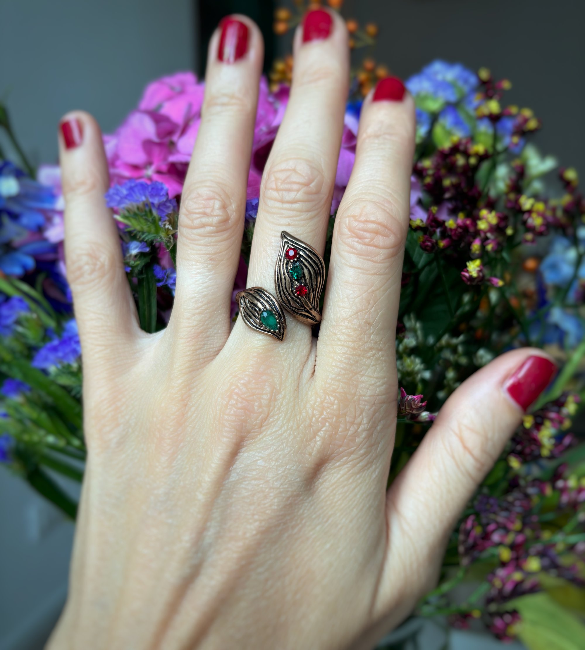 A ring born from the movement of nature: two red bronze leaves intertwine harmoniously, creating a fluid and sculptural embrace around the finger.