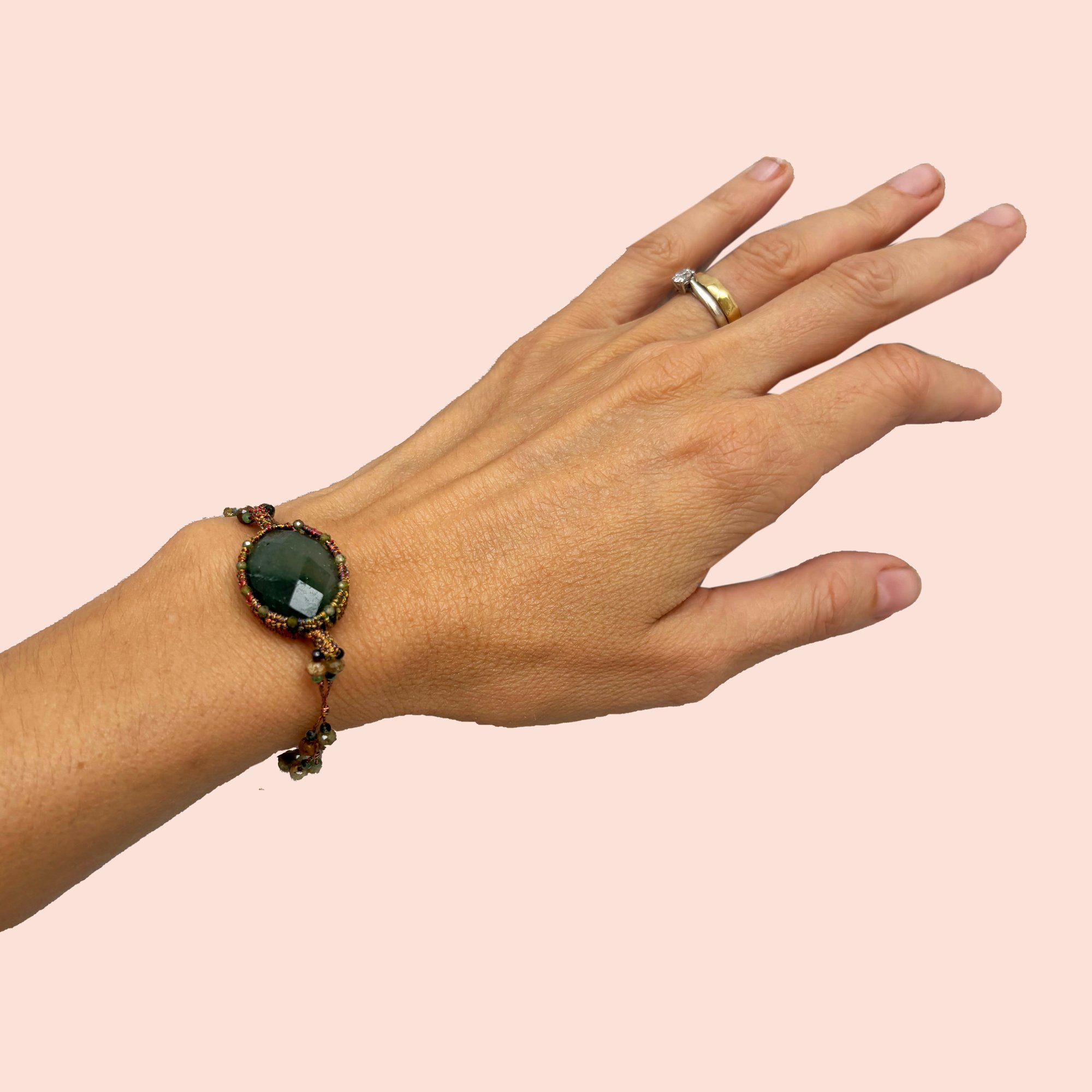 A handcrafted bracelet with a natural allure, crafted with hand-knotted gemstones, enhancing their brilliance and unique nuances. Lightweight and comfortable to wear, it's designed to harmoniously complement the matching necklace, but can also be worn alone as an elegant and refined detail.