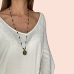 Una collana lunga e raffinata che unisce lavorazione artigianale e dettagli preziosi. Il filo alterna con cura pietre dure annodate a mano, creando una trama elegante e armoniosa. Al centro spicca il medaglione: una pietra naturale racchiusa in un castone decorativo che ne valorizza la luminosità e la rende protagonista del gioiello.