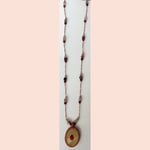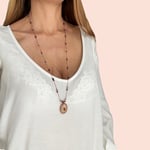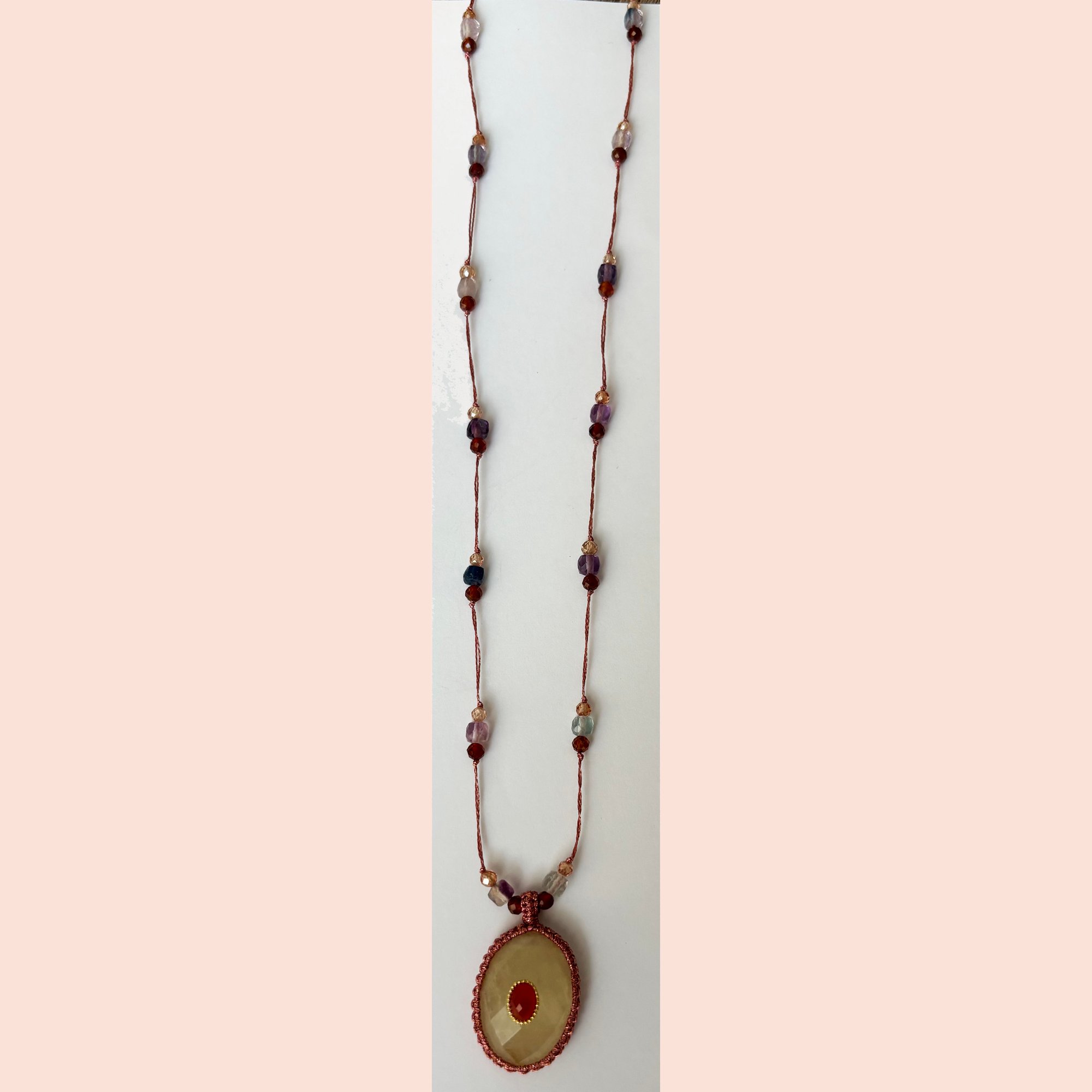 A long, refined necklace combining artisanal craftsmanship and precious details. The strand carefully alternates hand-knotted gemstones, creating an elegant and harmonious pattern. The medallion stands out at the center: a natural stone enclosed in a decorative bezel that enhances its brilliance and makes it the centerpiece of the piece.