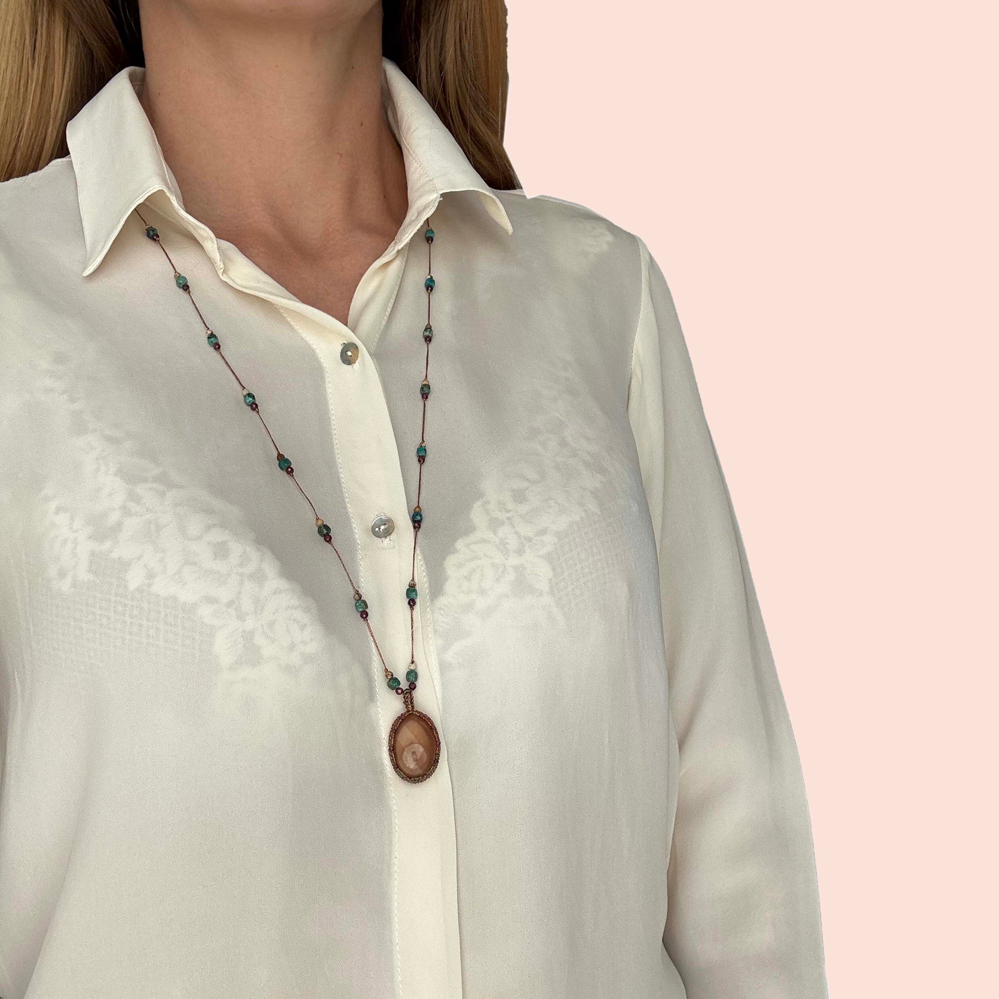 Una collana lunga, raffinata e artigianale, realizzata con un filo che alterna pietre dure annodate a mano, creando un ritmo elegante e armonioso. Il protagonista è il medaglione: una pietra naturale incastonata in un delicato intreccio di macramè, che ne esalta i colori e la bellezza unica.